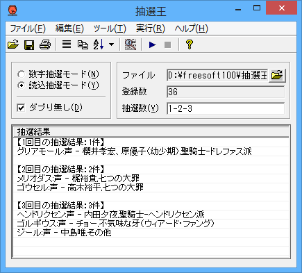 This software can be used for lotteries. It can be used to decide who is on duty for a club, or to decide who will win prizes at a social gathering or welcome party. It is easy to use; just set the minimum and maximum values and the number of draws (number of wins), then press the execute button. The winning numbers will be displayed in a list in the lottery results. You can also draw strings such as names and penalty game details.