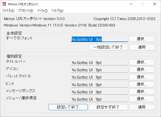 - I also hate Meiryo UI!! - 3.67 - (22 items) - Software to change system font in Windows 8/8.1/10/11 - This software allows you to change the Windows system font ("Meiryo UI" for Windows 8/8.1, "Yu Gothic" for Windows 10). While the system font was changeable in Windows 7 and earlier, the option to change it has disappeared in Windows 8 and later, making it impossible to change. This software allows you to change the system font to your liking, such as "MS UI Gothic" for a Windows 98 look, "Tahoma" for a Windows 2000/XP look, or using a handwritten font to enhance your originality.
