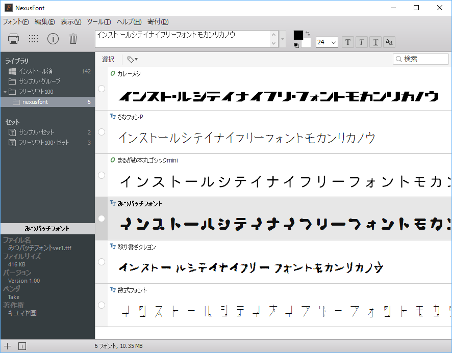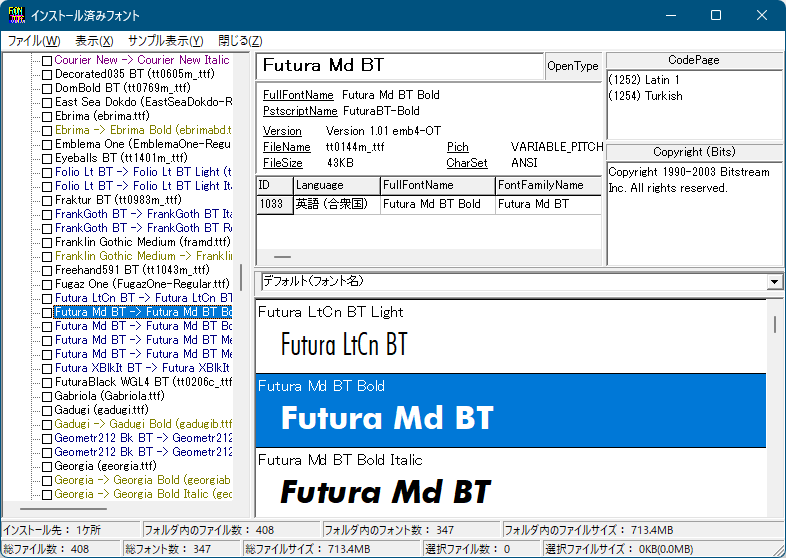 - Font Viewer Plus - 0 - (-) - A font management tool that allows you to manage installed and non-installed fonts. - You can display a list of installed fonts, display fonts that are not installed (TTF), draw what the entered text will look like, and save it as a BMP file.