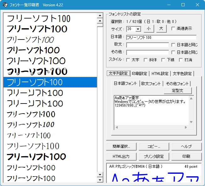 - Font List Printer - 2.00 - (3 items) - A utility that allows you to easily print a list of fonts. - You can easily specify Japanese, Roman, and other fonts, and print out font names and lists all at once, or output them as HTML. By entering characters into Japanese, Roman, and other fonts, and specifying the size, bold, italic, underline, and strikethrough, you can check how they will appear in each font.